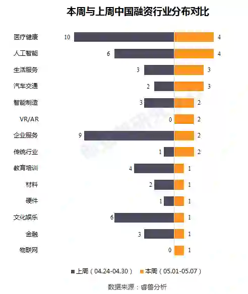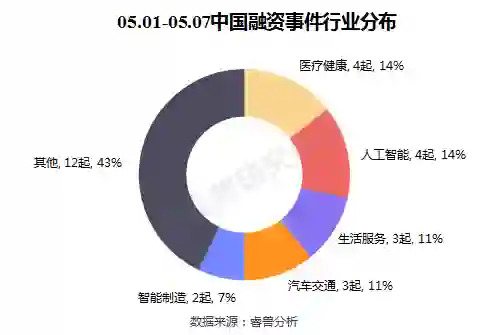 本周披露国内融资事件涉及14个行业领域,其中医疗健康、人工智能并列4起,生活服务、汽车交通并列3起,智能制造、VR/AR、企业服务、传统行业并列2起。