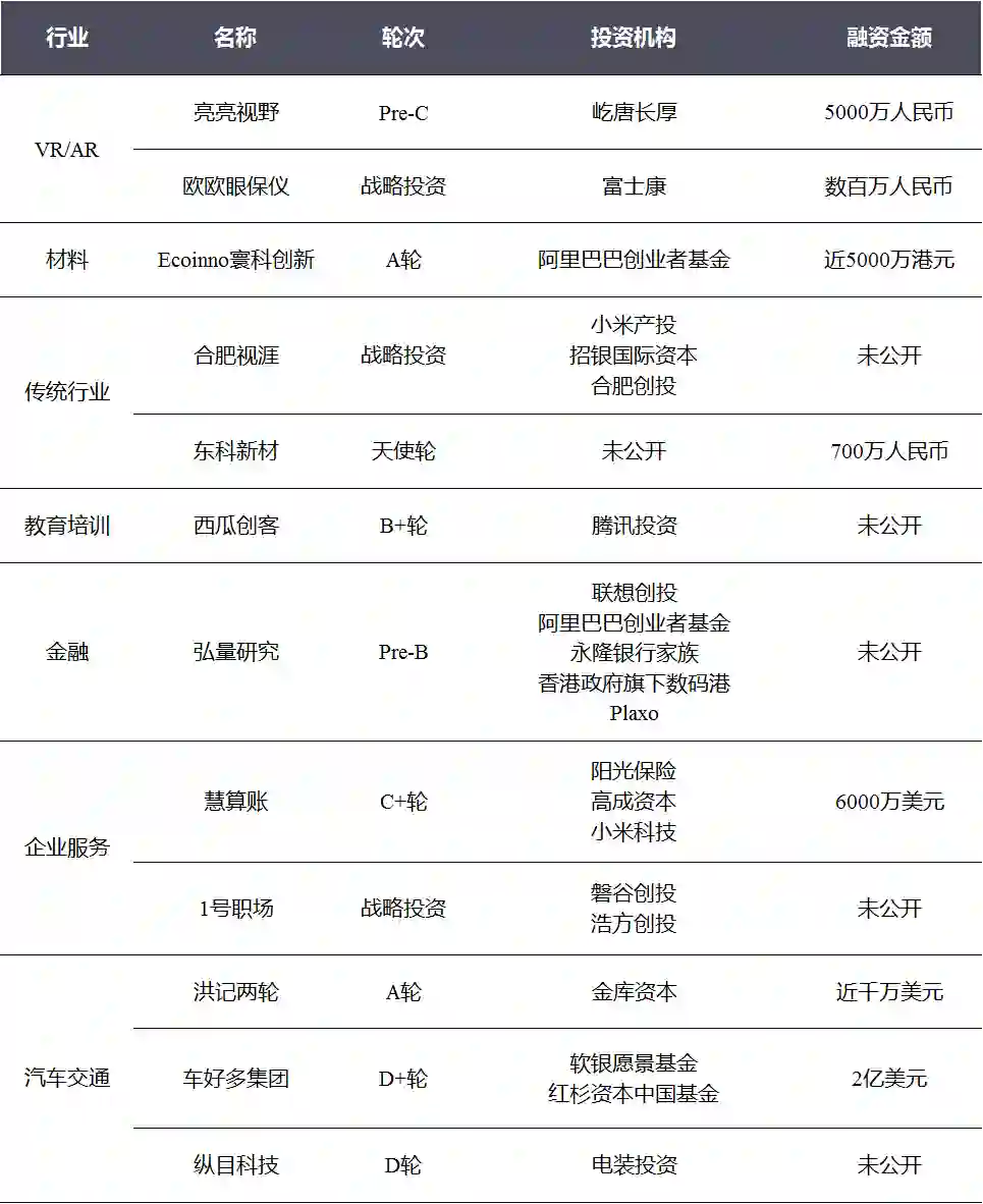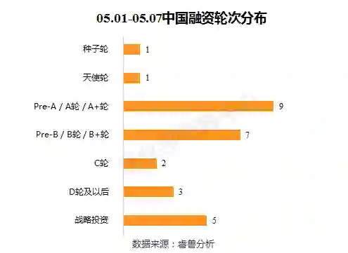 本周融资事件的融资轮次主要集中在中后期(B轮、C轮、D轮及以后),共12起;前期(种子轮、天使轮、A轮)有11起;战略投资本周有5起。