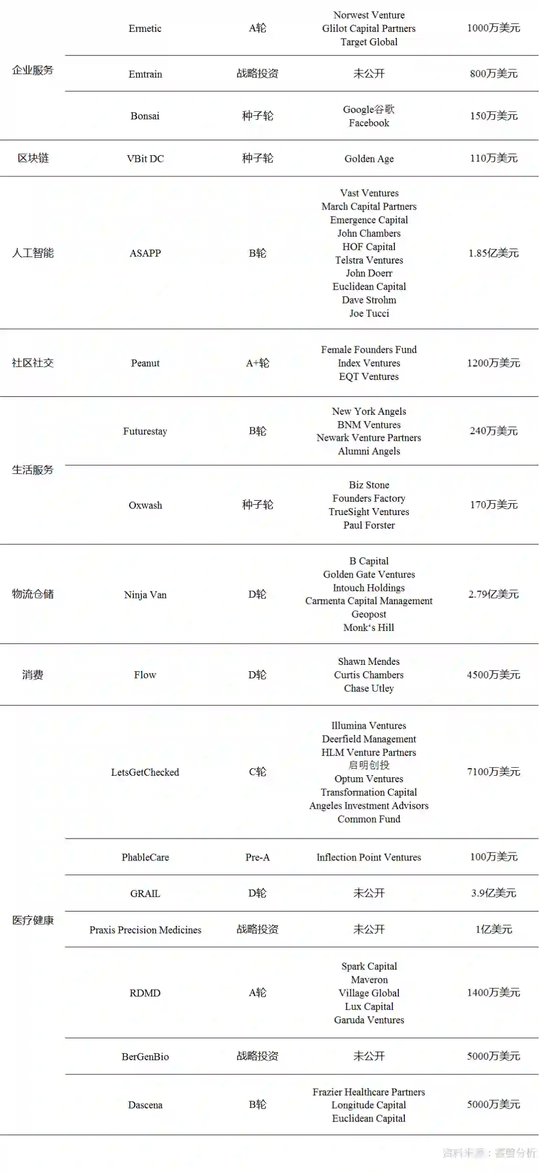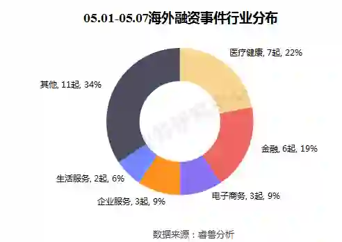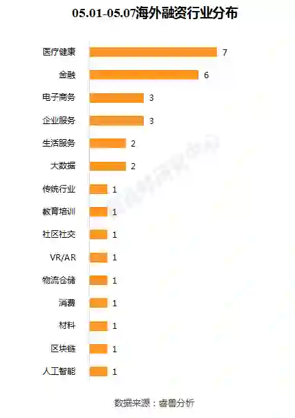 本周披露海外融资事件涉及15个行业领域,其中医疗健康7起,金融6起,电子商务、企业服务并列3起,生活服务、大数据并列2起。