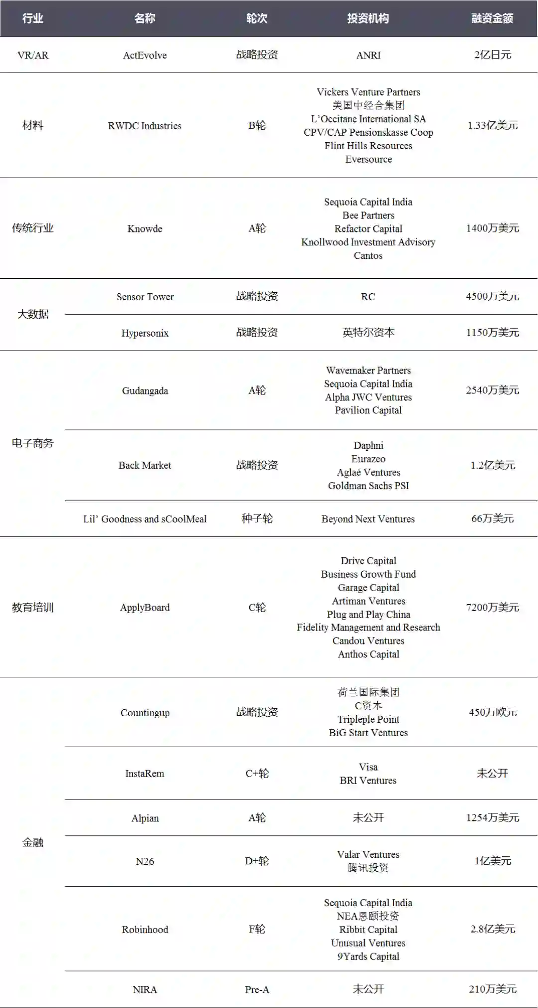 致力于研发生产可自然降解材料并作商用的新加坡生物技术初创企业「RWDC」完成1.33亿美元B轮融资。本轮投资由伟高达Vickers Venture Partners(全球风险投资公司)、Flint Hills Resources(全球领先的能源和资源公司)、CPV/CAP Pensionskasse Coop(瑞士最大零售公司的养老基金)和International SA(宜家控股公司旗下的私募基金)联合领投。