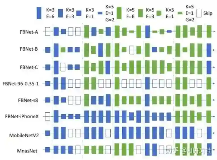 图注:FBNet搜索到的一些网络架构。K代表卷积核大小,E代表放大倍率,G代表卷积分组的参数图片来源:Wu et. al