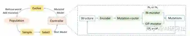 RENAS的主要思路在于:使用可微的强化学习控制器来增强锦标赛选择法的变异机制。