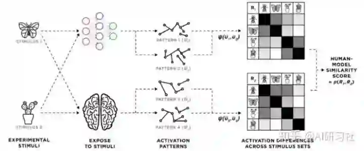为了定义HMS,作者建立了一种“表示性不相似程度矩阵”(RDM,representational dissimilarity matrix)来量化两个系统(这里是网络与人脑)对一对刺激的响应。给定两个RDM,HMS被定义为二者的斯皮尔曼等级相关系数。