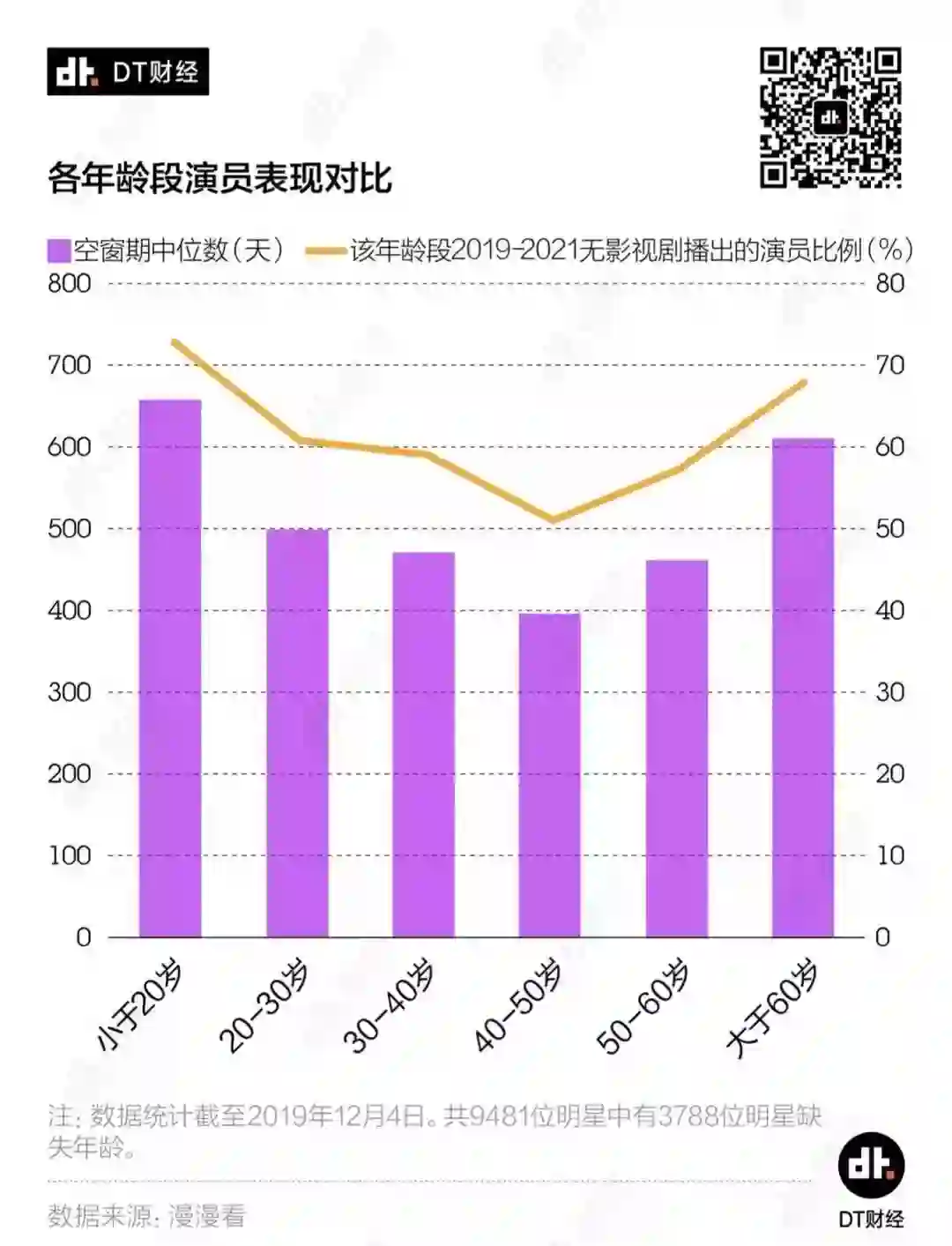 不管是空窗期时间,还是在2019年的空窗比例,40-50岁的“老戏骨“们都比其他年龄段的演员更低——也就是说,获得机会的概率会更高。