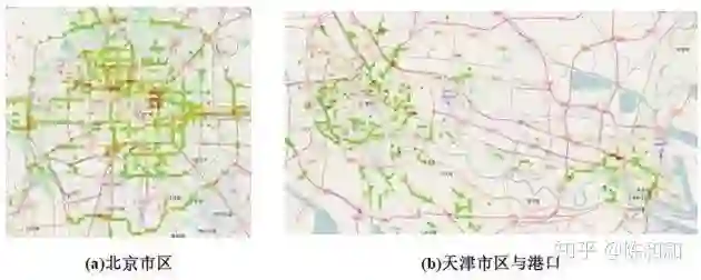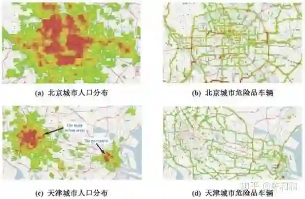 下图使用2015年1月的数据,展示了北京和天津两座城市中人口数量的分布和危险品车辆的分布情况(左图为人口分布,右图为危险品车辆分布)。