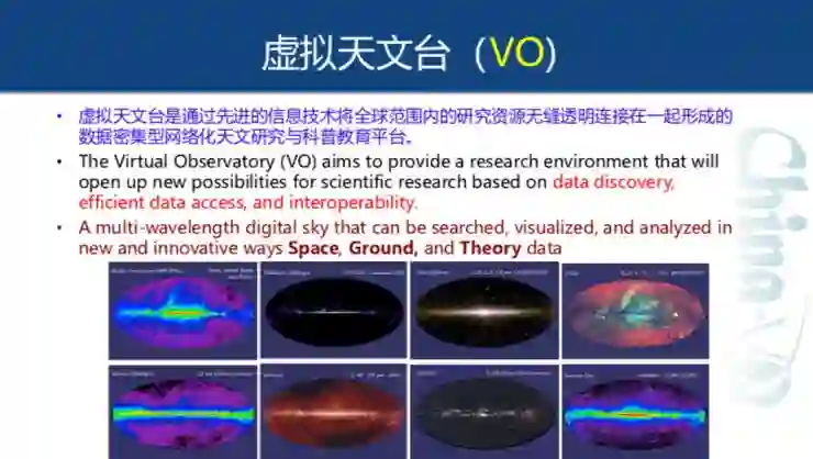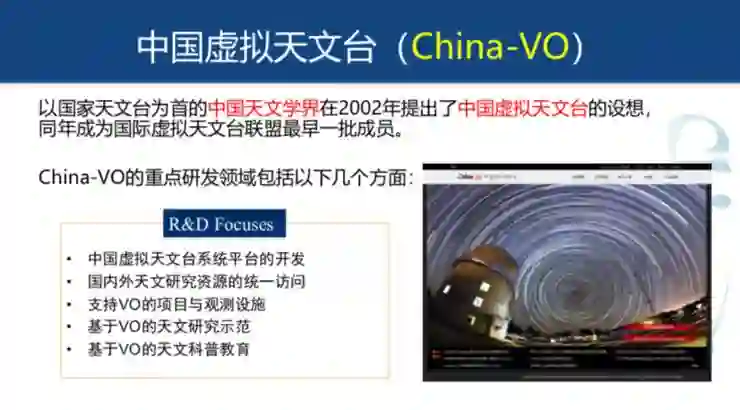 「虚拟天文台」是通过先进的信息技术将全球范围内的研究资源无缝透明连接在一起形成的数据密集型网络化天文研究与科普教育平台。