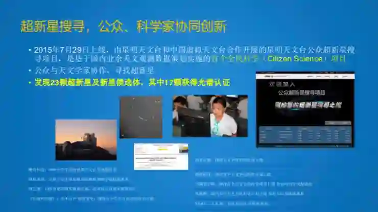 2015年,虚拟天文台和新疆乌鲁木齐一中的一位高中老师合作,打造了一个搜寻超新星的项目。有一个10岁合肥小朋友利用这个平台发现了超新星,成为全球最年轻的超新星发现者。