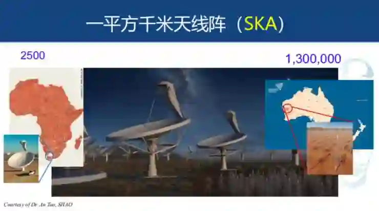 它由两大部分组成,其中一部分天线在南部非洲8个国家部署,另一端在西澳大利亚及新西兰由100多万天线构成。整个天线可以进行数据采集,在全球区域中心进行深入分析。这个望远镜能带来什么?它的原始数据每天可以达到5千个PB,处理之后会达到50个PB左右,进一步处理则可以变成数据产品供科学家使用。