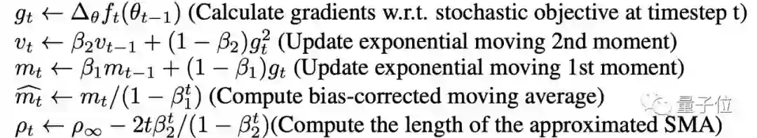 然后按照以下的迭代公式计算出:第t步时的梯度gt,移动量的二阶矩vt,移动量的一阶矩mt,移动偏差的修正和SMA的最大值ρt。
