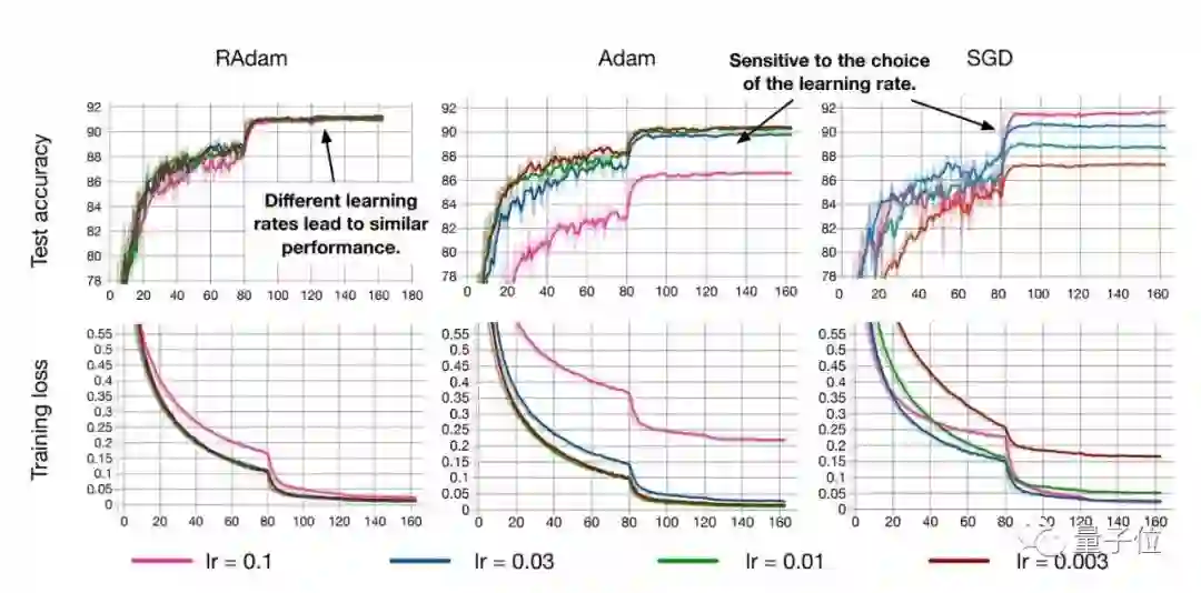 它兼有Adam和SGD两者的优点,既能保证收敛速度快,也不容易掉入局部最优解,而且收敛结果对学习率的初始值非常不敏感。在较大学习率的情况下,RAdam效果甚至还优于SGD。