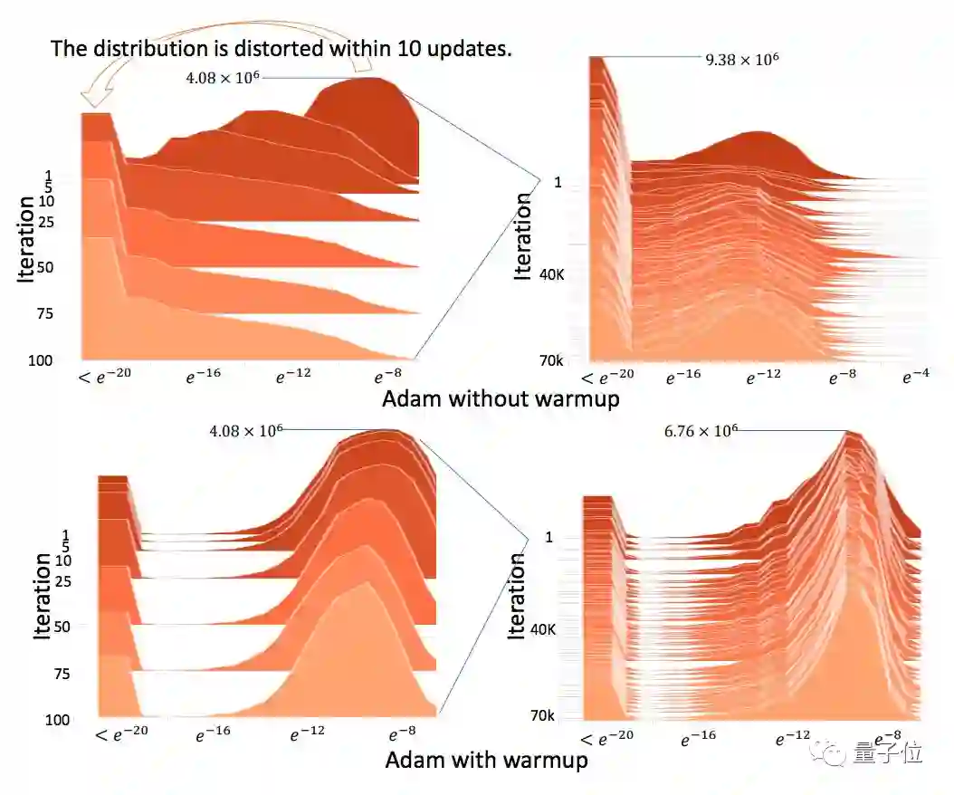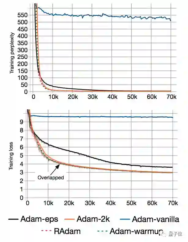 结果发现,一把预热拿掉,Transformer语言模型的训练复杂度 (Perplexity) ,就从10增到了500。