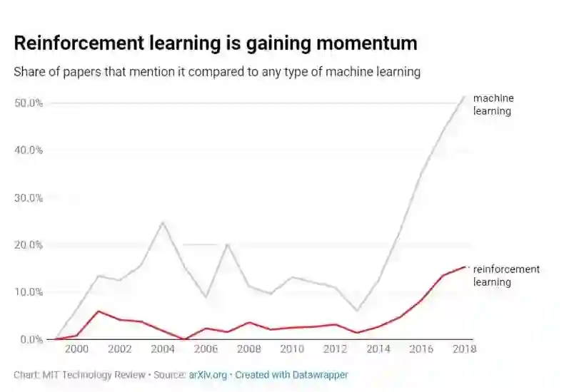 《麻省理工科技评论》发现,最近几年中,提及强化学习的论文数量大幅上升,强化学习论文在人工智能论文中的占比从2015年的4.7%上升为2018年的15.3%。