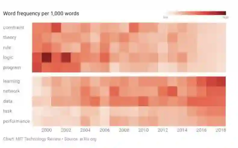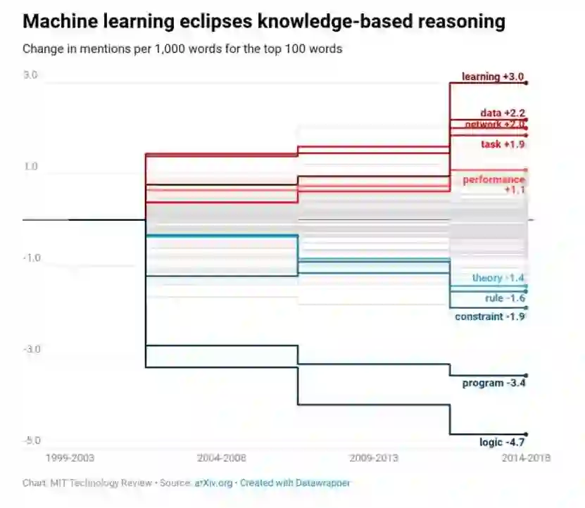 上述报告发现,在20世纪90年代末至21世纪初的人工智能论文中,“逻辑”、“规则”等与知识系统相关的词,数量开始下降,而“数据”、“网络”、“性能”等与机器学习相关的词汇出现的次数快速增长。