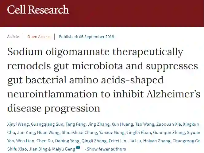 2019年9月6日,中国科学院上海药物所耿美玉团队的一篇研究登上了被称为“国刊之光”的Cell Research(今年IF首次突破20)封面。研究题为“Sodium oligomannate therapeutically remodels gut microbiota and suppresses gut bacterial amino acids-shaped neuroinflammation to inhibit Alzheimer’s disease progression”,封面用一句话概括了GV-971的原理:通过重建肠道菌群,来治疗阿尔茨海默病 (AD)。