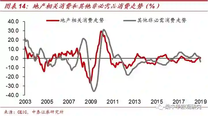 而且我们还发现,房地产相关消费增速和其他非必需消费增速是同涨同跌的,并没有表现出房地产相关消费多了就抑制其它消费的现象,这也说明房地产带来的替代效应并不明显。