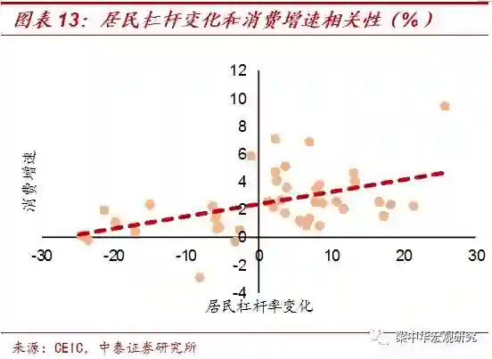 我们发现,各主要经济体的居民杠杆率和消费增速确有一定负相关,即居民债务水平越高,消费增速越低,但这种相关性在统计上是比较微弱的。
