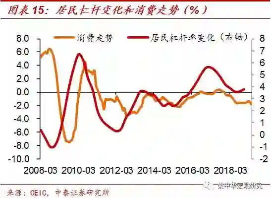和国际经验相类似,我们发现居民杠杆率的变化反而和我国消费周期完全吻合,居民加杠杆快的时候,消费也好,而加杠杆慢或者去杠杆时消费也相对较差。