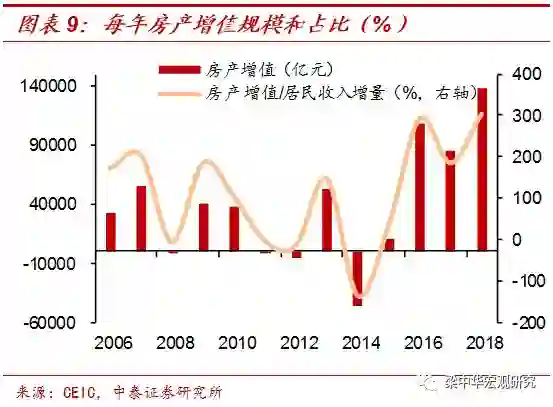 同样的道理,2018年我国居民房产增值规模更是高达14万亿,是居民可支配收入增幅的3倍还要多。除了房产以外,由于居民配置的债券、股权等其他资产很大程度上也和房地产有关,房价上涨时也会享受增值收益。
