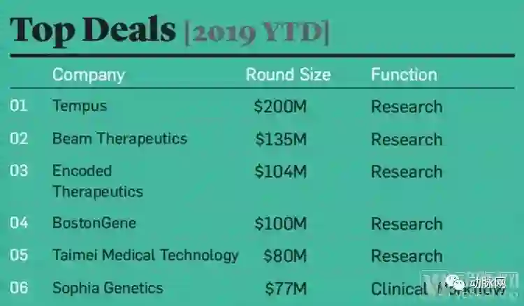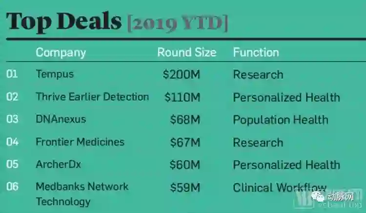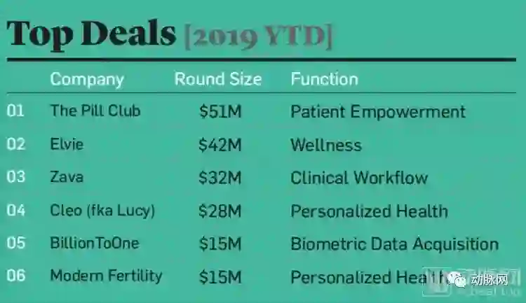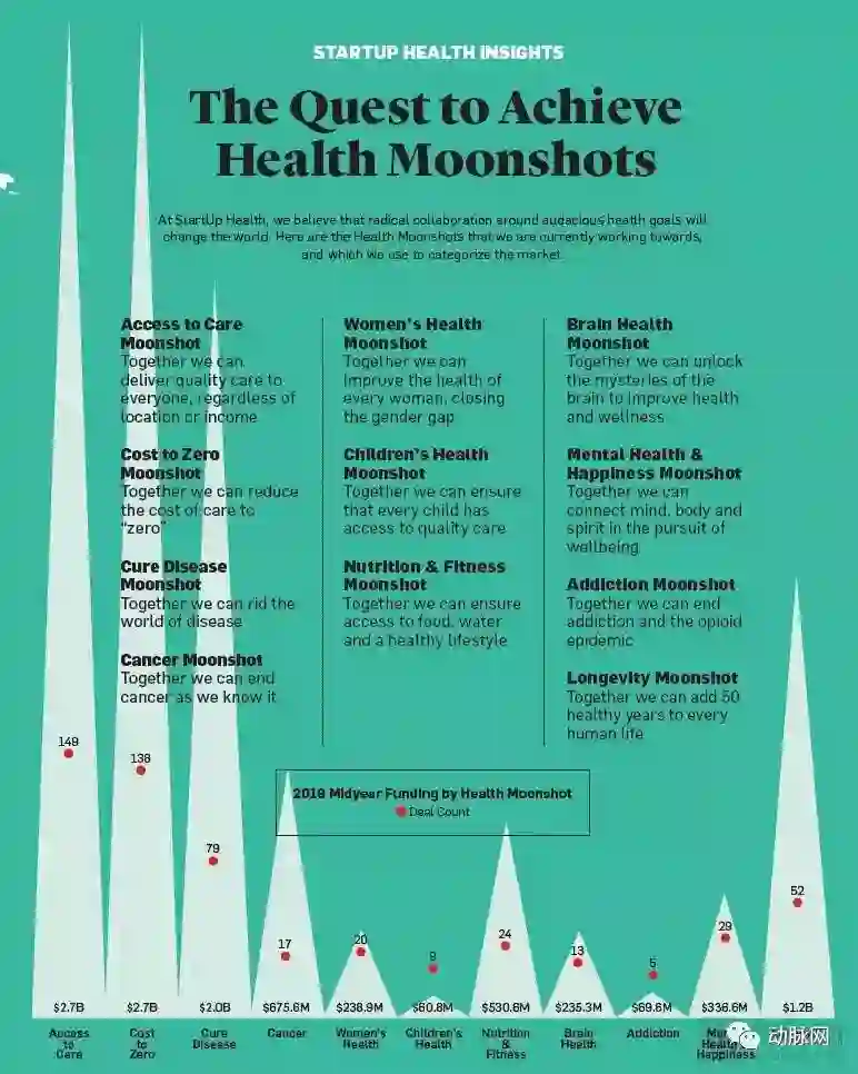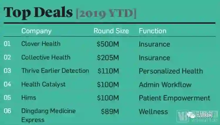 动脉网根据StartUp Health的半年报,整理了在2019年上半年11个细分医疗领域的投融资情况。