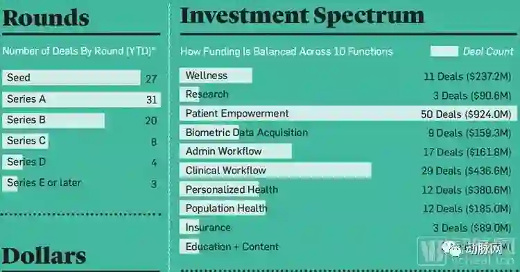 从交易轮次和投资者投资的频率来看,A轮融资占比最大,有31次;Patient Empowerment(患者赋权)获得的投资次数最多,有50次投资,投资总额达到9.24亿美元。而在该领域投资数额最大的几笔投资如下图所示。