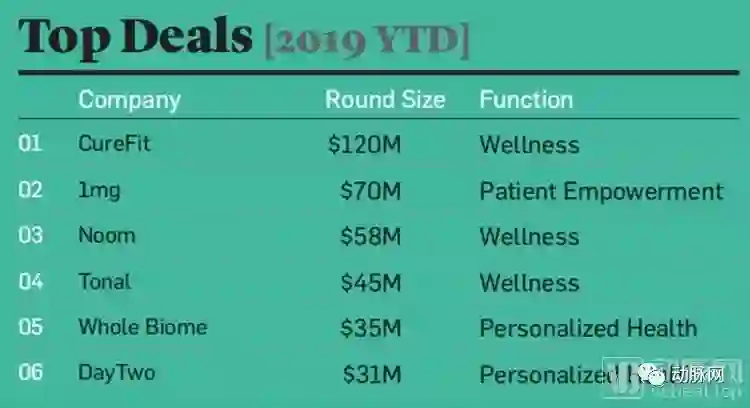 从交易轮次和投资者投资的频率来看,A轮和种子轮融资占比最大,都有4次;Wellness (健康)获得的投资次数最多,有17次投资,投资总额达到3760万美元。而在该领域投资数额最大的几笔投资如下图所示。