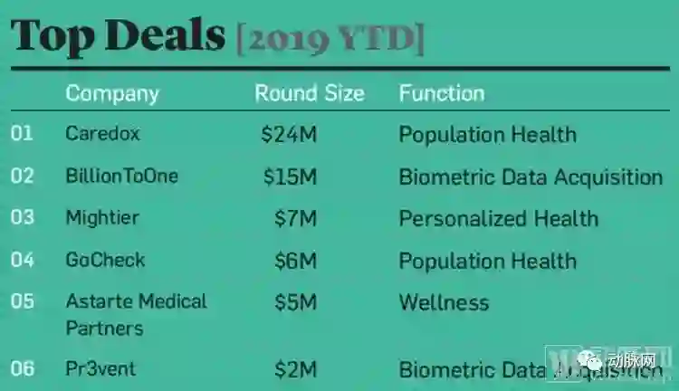 从交易轮次和投资者投资的频率来看,A轮融资和B轮融资占比分列一二,分别有20次的19次;Biometric Data Acquisition(生物识别数据采集)和Clinical Workflow(临床工作流程)获得的投资次数并列第一,都有15次投资,投资总额分别达到了1.64亿美元、2.86亿美元。而在该领域投资数额最大的几笔投资如下图所示。