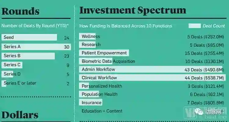 从交易轮次和投资者投资的频率来看,A轮融资占比最大,有30次;Clinical Workflow(临床工作流程)和Admin Workflow(管理工作流程)获得的投资次数位列一二,分别有44次和43次投资,投资总额分别达到了5.38亿美元、4.9亿美元。而在该领域投资数额最大的几笔投资如下图所示。