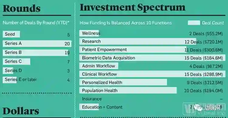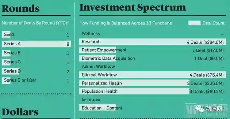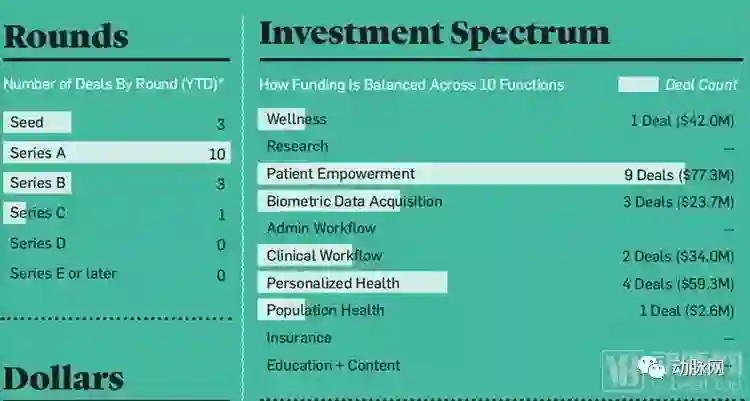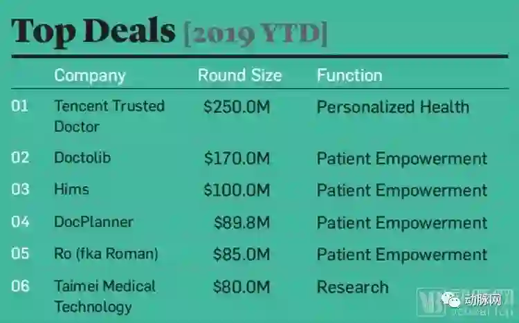 从交易轮次和投资者投资的频率来看,A轮融资占比最大,有10次;Patient Empowerment(患者赋权)获得的投资次数最多,有9次投资,投资总额达到7730万美元。而在该领域投资数额最大的几笔投资如下图所示。