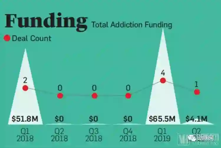 “成瘾治疗”领域是一个比较“弱势”的领域,从2018年上半年到2019年上半年出现了了明显的季度环比下降(-94%)。