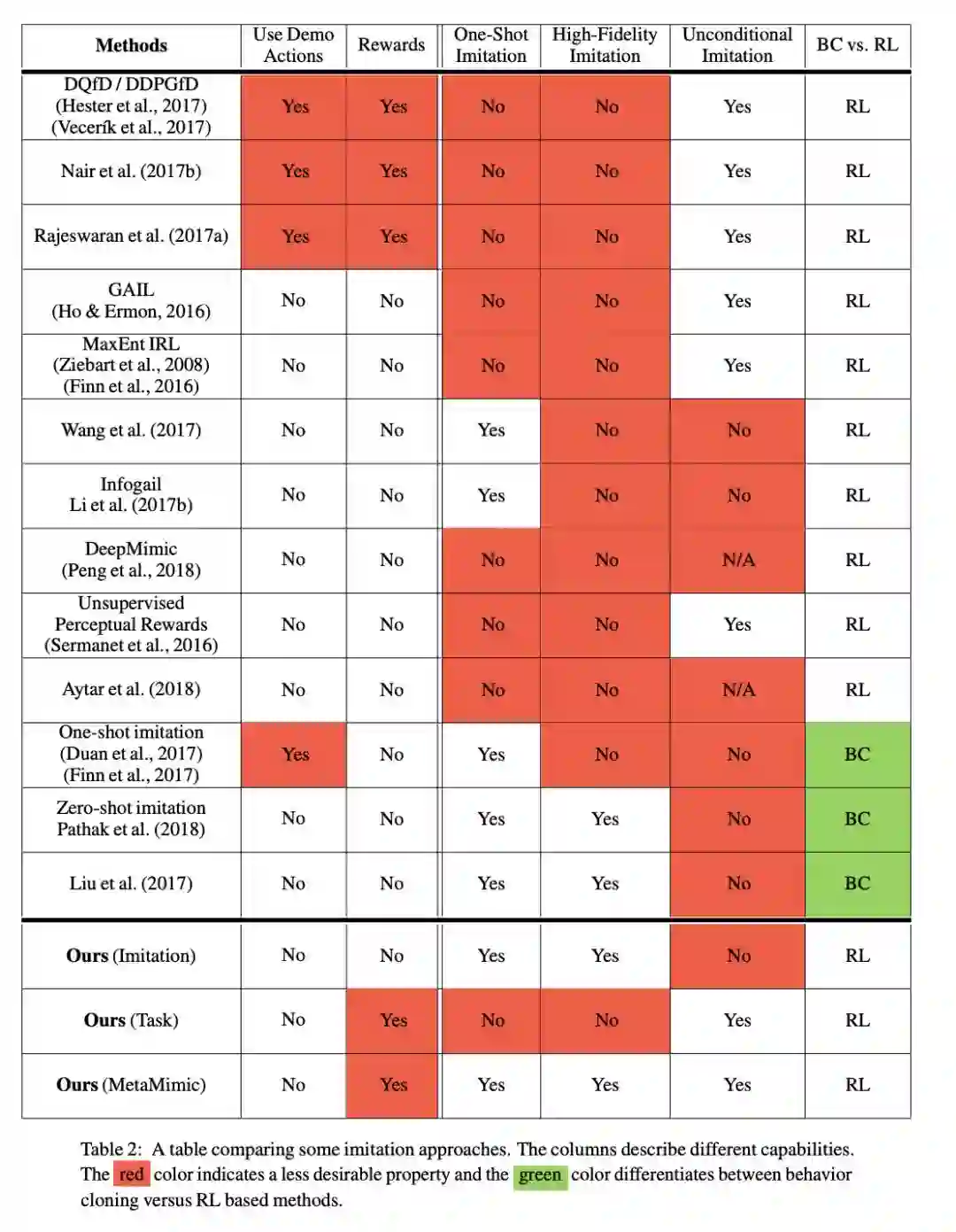 ABSTRACT Humans are experts at high-fidelity imitation – closely mimicking a demonstration, often in one attempt. Humans use this ability to quickly solve a task instance, and to bootstrap learning of new tasks. Achieving these abilities in autonomous agents is an open problem. In this paper, we introduce an off-policy RL algorithm (MetaMimic) to narrow this gap. MetaMimic can learn both (i) policies for high-fidelity one-shot imitation of diverse novel skills, and (ii) policies that enable the agent to solve tasks more efficiently than the demonstrators. MetaMimic relies on the principle of storing all experiences in a memory and replaying these to learn massive deep neural network policies by off-policy RL. This paper introduces, to the best of our knowledge, the largest existing neural networks for deep RL and shows that larger networks with normalization are needed to achieve one-shot high-fidelity imitation on a challenging manipulation task. The results also show that both types of policy can be learned from vision, in spite of the task rewards being sparse, and without access to demonstrator actions.