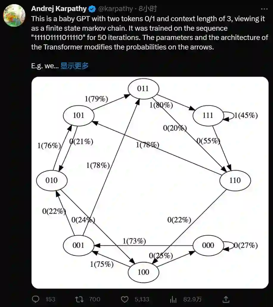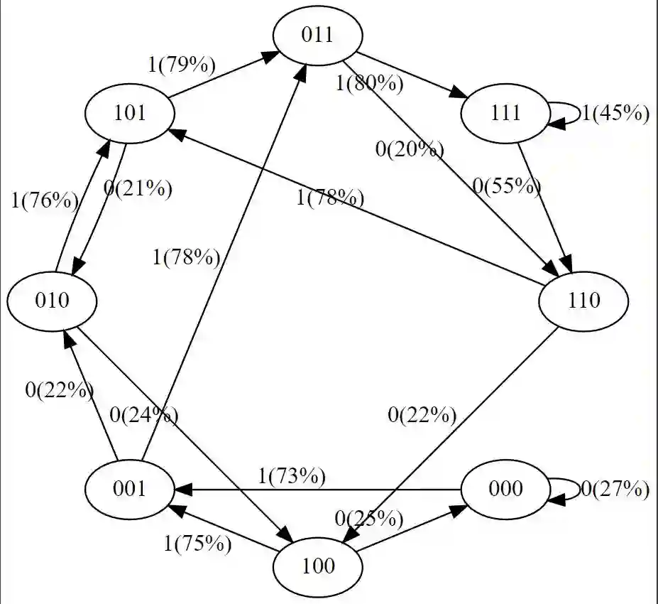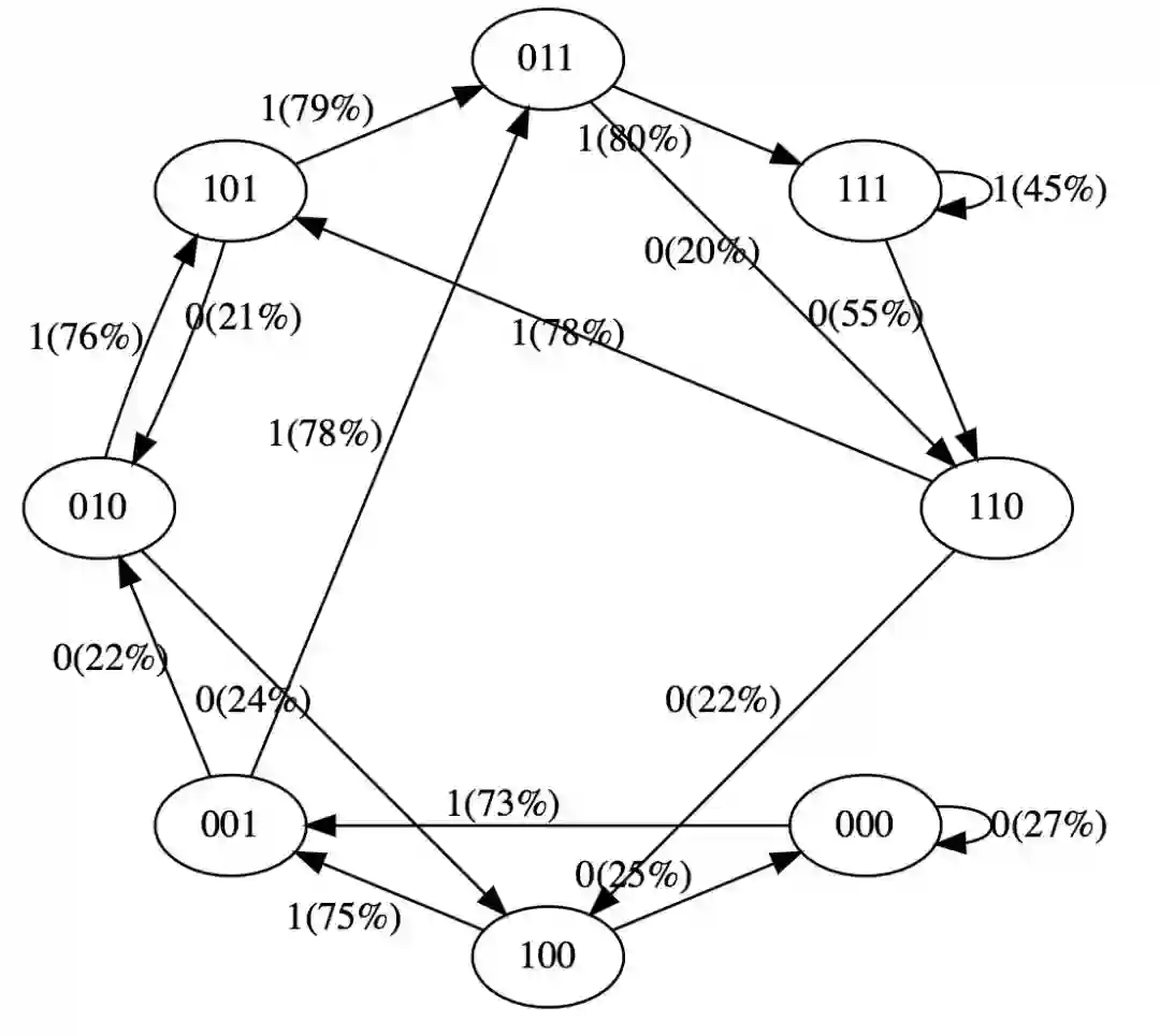 # we'll use graphviz for pretty plotting the current state of the GPTfrom graphviz import Digraphdef plot_model ():dot = Digraph (comment='Baby GPT', engine='circo')for xi in all_possible (gpt.config.vocab_size, gpt.config.block_size):# forward the GPT and get probabilities for next tokenx = torch.tensor (xi, dtype=torch.long)[None, ...] # turn the list into a torch tensor and add a batch dimensionlogits = gpt (x) # forward the gpt neural netprobs = nn.functional.softmax (logits, dim=-1) # get the probabilitiesy = probs [0].tolist () # remove the batch dimension and unpack the tensor into simple listprint (f"input {xi} ---> {y}")# also build up the transition graph for plotting latercurrent_node_signature = "".join (str (d) for d in xi)dot.node (current_node_signature)for t in range (gpt.config.vocab_size):next_node = xi [1:] + [t] # crop the context and append the next characternext_node_signature = "".join (str (d) for d in next_node)p = y [t]label=f"{t}({p*100:.0f}%)"dot.edge (current_node_signature, next_node_signature, label=label)return dotplot_model ()