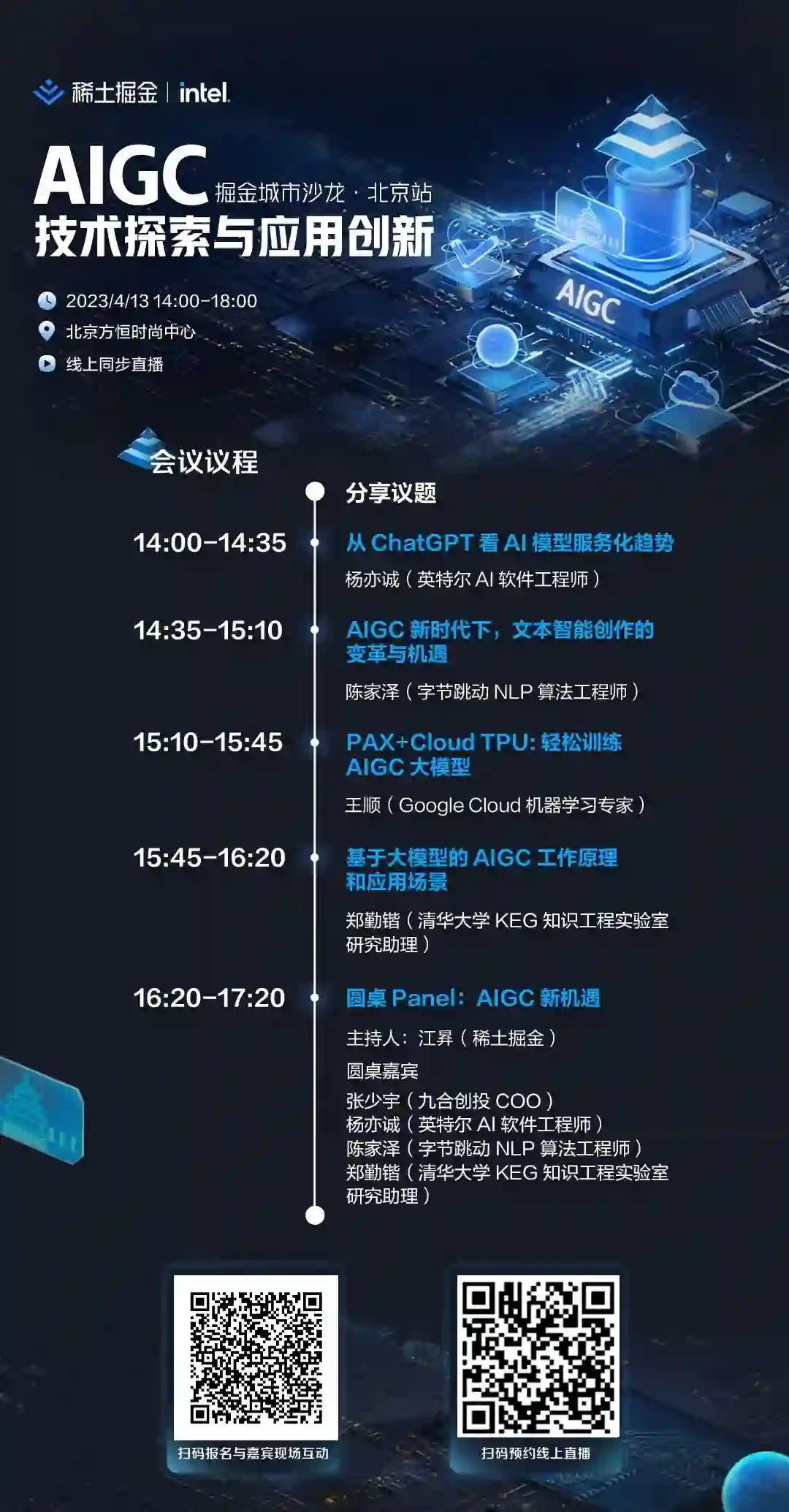 畅聊「AIGC 技术探索与应用创新」,字节跳动 NLP 算法工程师陈家泽、英特尔 AI 软件工程师杨亦诚、Google Cloud 机器学习专家王顺、清华大学 KEG 知识工程实验室研究助理郑勤铠、九合创投 COO 张少宇、稀土掘金江昪等多位业界专家已集结完毕。