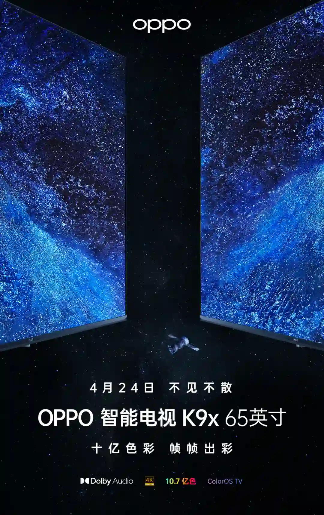 OPPO 昨日上架 65 英寸 OPPO K9X 电视,售价 2499 元,首发到手价 2199 元。根据 OPPO 商城显示,OPPO K9X 电视采用 65 英寸屏幕,屏占比超 95%,4K 分辨率,60Hz 刷新率,支持 10 亿色彩、70% NTSC 色域、自研 AI PQ;搭载联发科 4 核处理器,配备 2GB+16GB 存储空间;拥有双频 Wi-Fi、2 单元 20W 扬声器(支持杜比音效)、蓝牙 5.0;运行新一代 ColorOS TV 系统。
