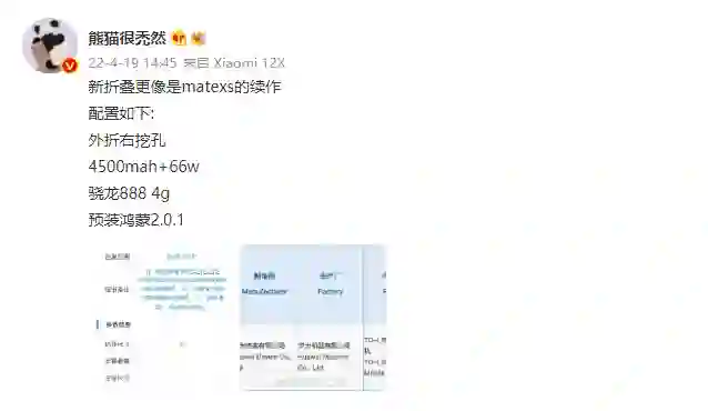 数码博主 @熊猫很禿然 今日爆料,华为新折叠更像是 Mate Xs 的续作,配置如下:外折右挖孔,4500mAh 电池、66w 快充,骁龙 888 4g,预装鸿蒙 2.0.1。据此前报道,该机为 8 英寸大小的折叠手机,外折屏设计比内折方案减少一块屏幕,相应的屏幕组件的厚度也会减小,更容易使手机做得较薄,还保留了一个持握的边框设计。华为 Mate X3 在处理器方面只会采用有限数量的麒麟 9000 和骁龙处理器,短期也不会更新麒麟系列处理器。但是在屏幕方面,该机希望采用国产护眼屏幕,支持 1920 级 PWM 调光和 LTPO 省电技术。