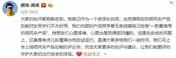 此外,滴滴出行总裁柳青也通过微博表达了歉意:作为一位资深女白领,也觉得现在的顺风车产品功能对女同学不太好用;给朋友们心里添堵。但在安全问题上,是如履薄冰地试运行。