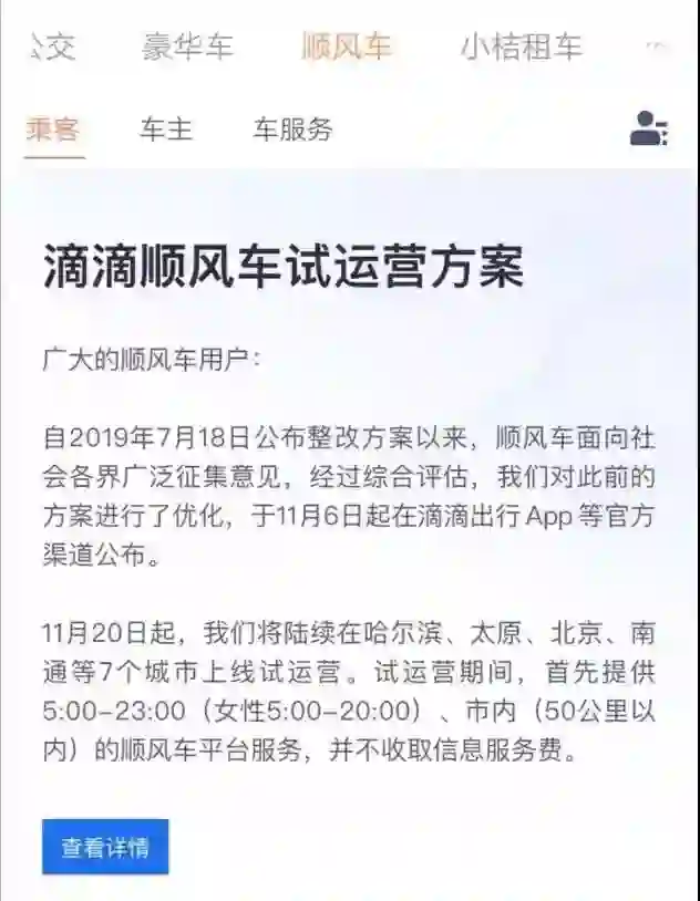 6日,滴滴出行App公布了滴滴顺风车试运营方案,宣布将于11月20日起,陆续在哈尔滨、太原、石家庄、常州、沈阳、北京、南通7个城市上线试运营。试运营期间,将在这7个城市首先提供5:00-23:00(女性5:00-20:00)、市内中短途(50公里以内)的顺风车平台服务。试运营期间,不收取信息服务费。