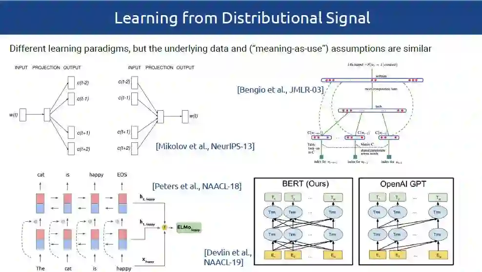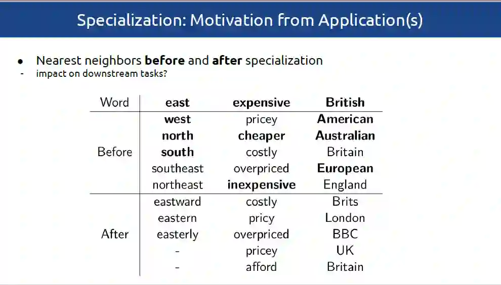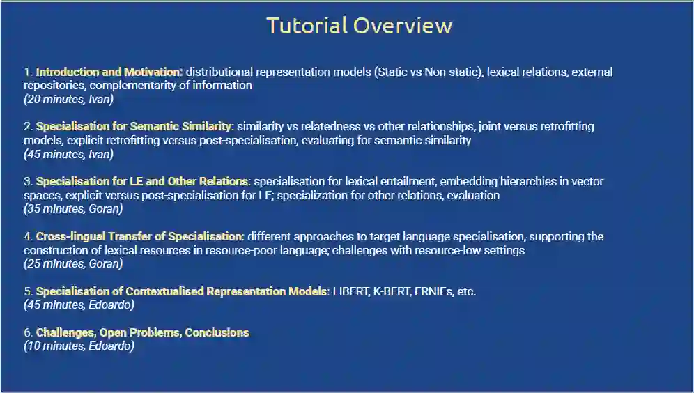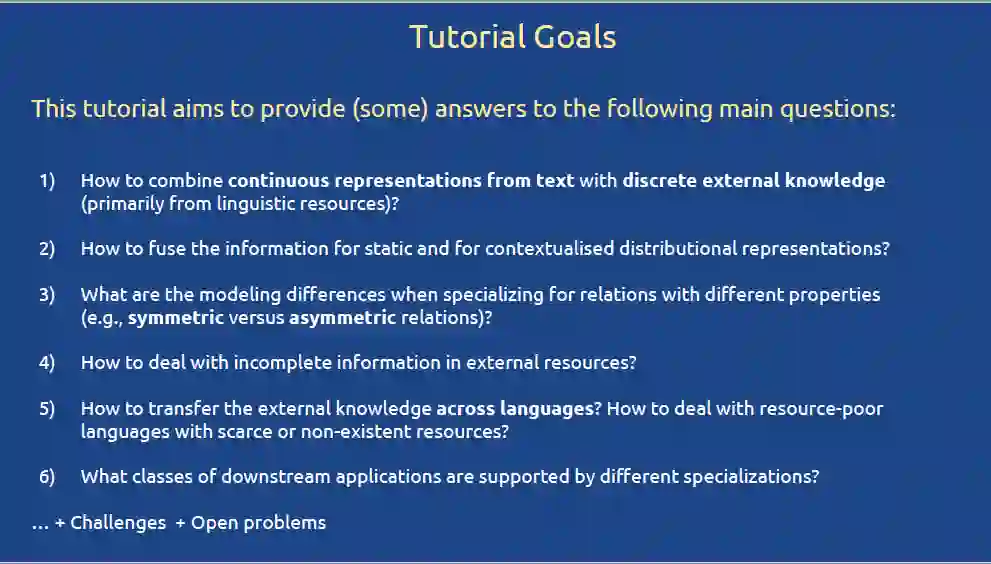 在该教程中,作者对分布式词向量的语义特定化(Semantic Specialization of Distributional Word Vectors)方法进行了全面的概述,包括以下几点:1)joint specialization 方法,利用外部语言约束来增强分布式学习的目标。2)post-processing retrofitting模型:微调预训练的分布式词向量,以便更好地反映外部语言约束。3)最新提出的post-specialization方法,能够将2)中的post-processing方法扰动推广到整个分布式空间。