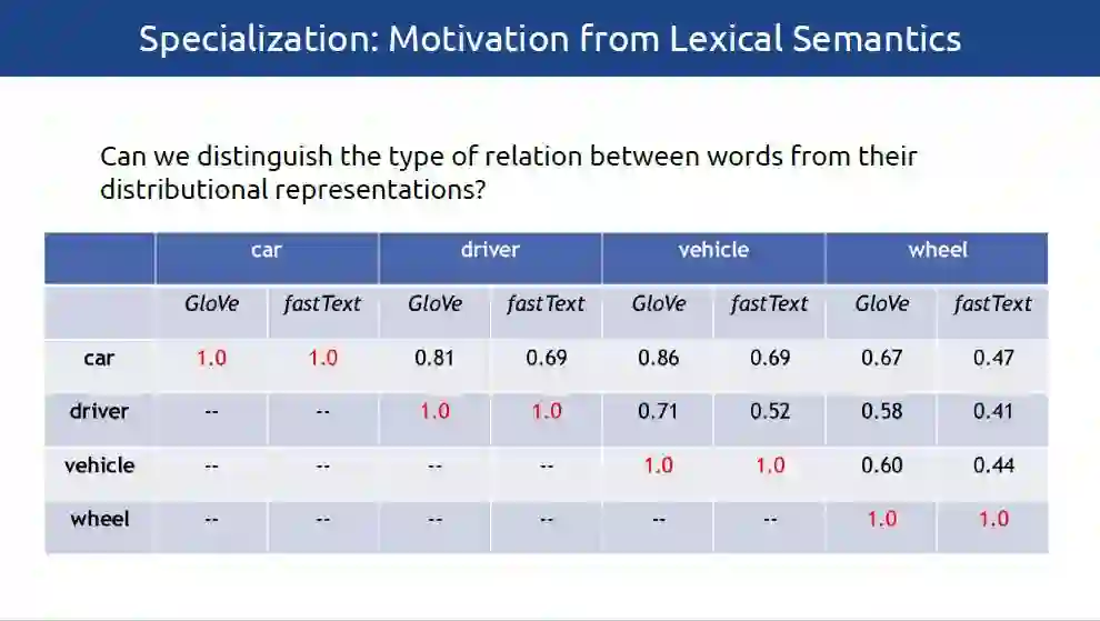 当前,分布式词向量已经成为NLP模型必不可少的一部分。基于潜在分布假设,分布式词向量,融合了各种聚合型和组合型的词汇语义关系。比如,基于分布式向量空间距离的主题关联,经常不能区分诸如同义词、相似词(car-automobile)或者词义蕴含(car-vehicle)等这些关系。由于不同的词汇语义关系支持不同的NLP应用,所以分布式空间的内在属性通常会影响下游应用的表现。如语义相似性为意译、对话状态跟踪和文本简化提供了指导,词义蕴涵支持自然语言推理和分类归纳,而更加广泛的主题关联则有助于命名实体识别、文本分类以及检索等任务。