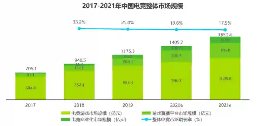 2017年,中国电竞市场规模为706亿,2018年和2019年,电竞市场规模增幅都在25%以上,