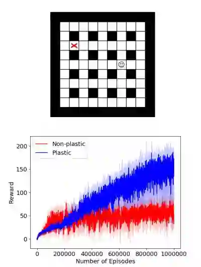 此前一直都有人研究在进化算法中利用可塑性连接来设计神经网络(Soltoggio et al. 2017),但是在深度学习方面的研究相对较少。然而,考虑到为复杂任务设计传统非可塑性神经网络时得到的不错的梯度下降结果,将反向传播训练运用到具有可塑性连接的网络是非常有意义的——通过梯度下降不仅能优化基础权重,还能优化每个连接的可塑性量。研究者之前论证过这个方法的理论可行性和分析易行性(Miconi, 2016)。