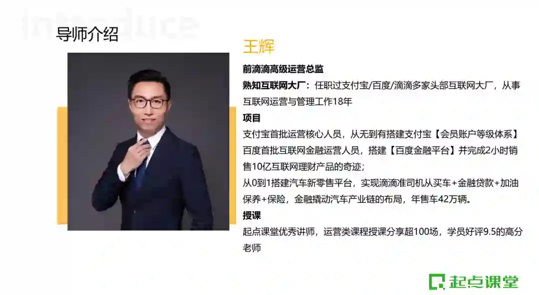 王辉老师从事互联网运营与管理工作18年,先后任职支付宝、百度、滴滴等知名互联网公司;