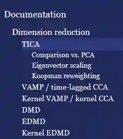 以上图红框中标出的动态数据降维算法为例,鼠标点击该算法,在一级标题下会出现其包含的子标题。点击你想了解的词条,即可链接到相应的说明文档。例如当你点击 Dimension reduction,会出现下级目录,如 TICA、VAMP/time-lagged CCA 等。点击相应算法即可链接到对应的说明文档。