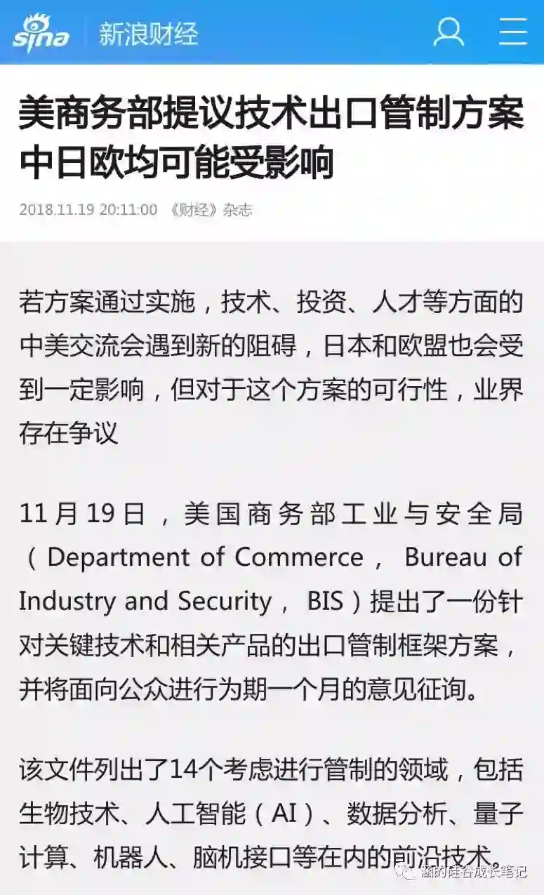 11月19日,美国商务部工业安全局发布了一项,针对“关键”技术出口限制的最新草案,正在征询意见。其中,人工智能技术赫然在列。