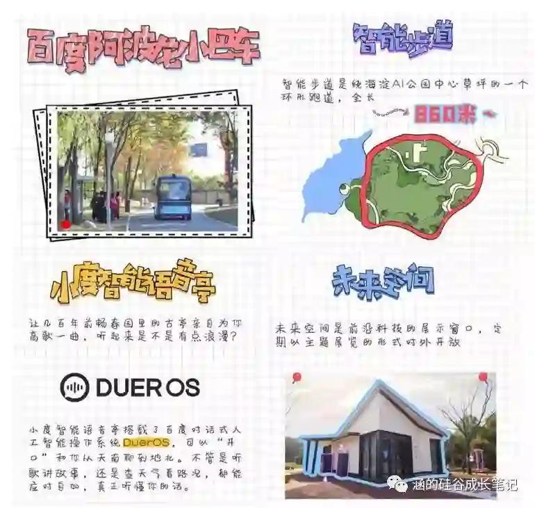 公园里,运行着全球首款量产L4级无人小巴车“阿波龙”;还有,能记录你运动状态的智能跑道,不用佩戴设备就可以查看卡路里消耗;以及,DuerOS助力的智能语音凉亭;还有,可以体验AR太极、刷脸购物的“未来空间”。