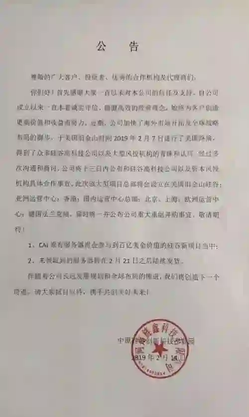 2月17日,链鑫公司则在公告中称,公司于旧金山时间2019年2月7日进行了美国路演,得到众多硅谷高科技公司和风投机构的青睐,决定将公司总部迁往美国旧金山硅谷,并承诺,“美国硅谷科技公司”将按照市场价回收CAI币……