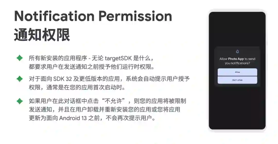 隐私和安全仍然是 Android 系统的首要任务。Android 13 新增了需向用户发送申请的通知权限、用于保护隐私的照片选择器,以及更加细化的媒体权限(改进与附近设备配对以及访问媒体文件时的权限)。
