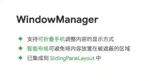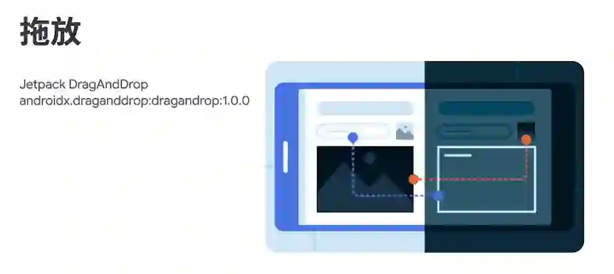 作为官方指导和规范的具体实现,Jetpack 库也包含了针对大屏幕开发的许多常见功能,比如 Drag & Drop 可以帮助应用更简单地实现交互式的拖放功能,进多任务处理。WindowManager 作为用于检测设备姿态、屏幕尺寸的基础库,能够实现活动嵌入,应用更轻松地在现有视图的基础上支持更大屏幕的布局。