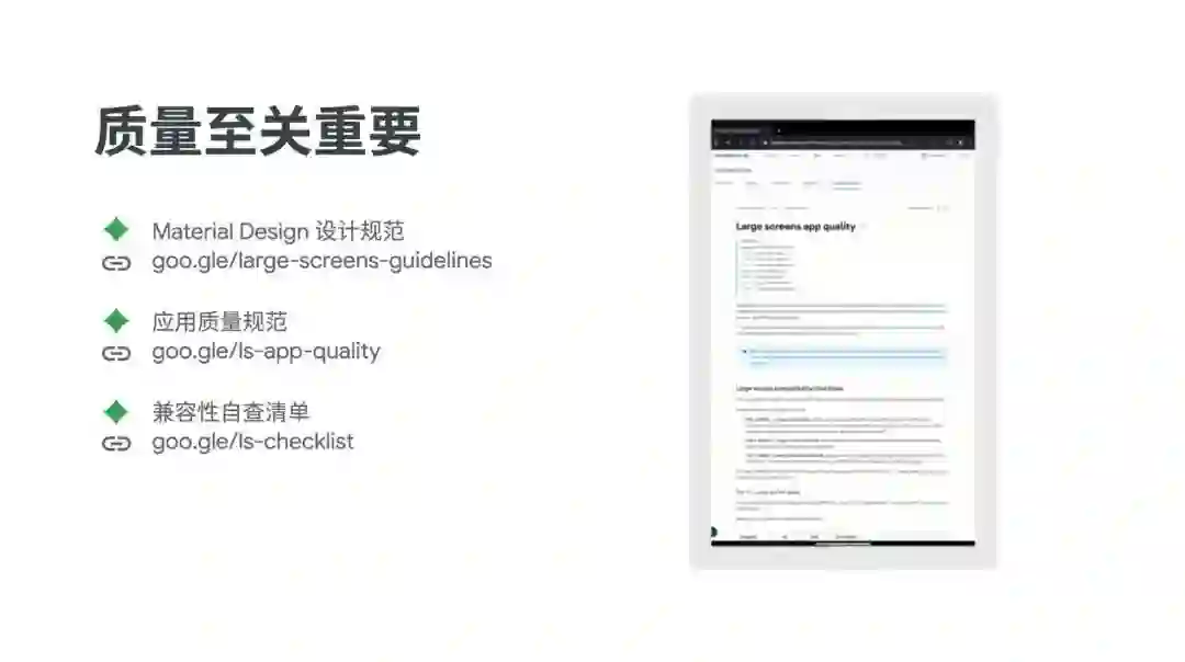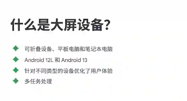 Android 12 L 和 Android 13 针对不同类型的设备优化了用户体验,包括任务栏、多任务、键盘鼠标支持和应用兼容模式等。创建了“大屏幕应用质量指南”和“Material Design 布局规范”,帮助开发者们为大屏幕优化自己的应用。开发者可以建立跨手机、平板电脑、可折叠设备和可穿戴设备的应用,实现单一应用在不同终端均可运行。
