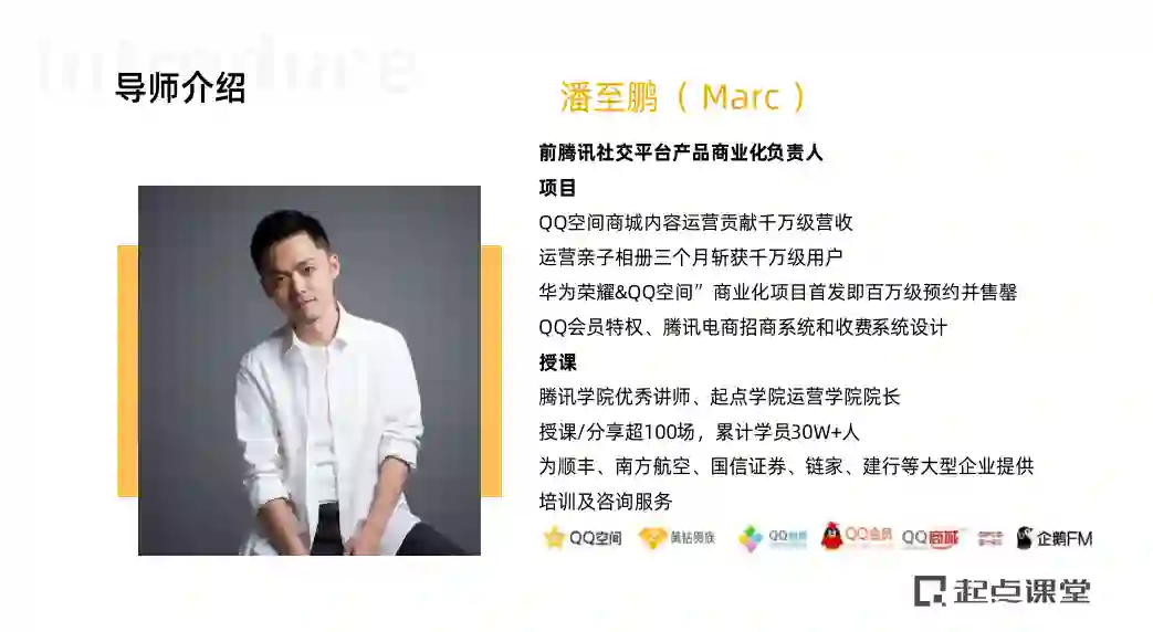 潘至鹏老师作为一个有着近15年运营实战经验导师,05年入职腾讯,任职10年,从实习生晋升为高级运营经理,见证了多款亿万级用户产品成长的全过程,对于运营有着深厚独到的见解。