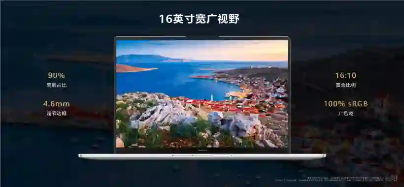 华为 MateBook 16s 采用一块 2.5K 触控屏,屏占比 90%,3:2 比例。MateBook 16s 的屏幕平均 ΔE<1,获得德国莱茵专业级色准和快速稳定认证,支持 10.7 亿色,100%sRGB 广色域,并且还获得德国莱茵低蓝光、无频闪双重认证。